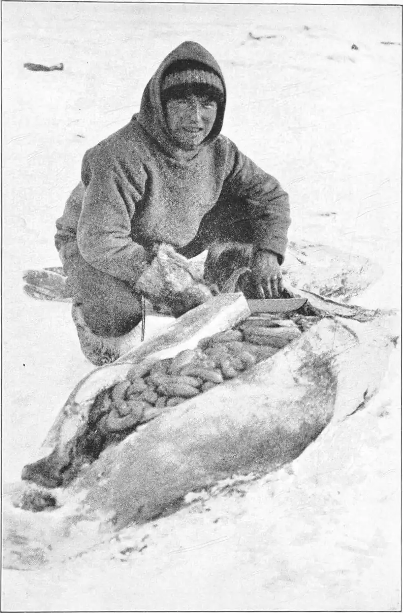 The men had little rest these days. It is a weary business to be out for ten hours at a stretch, first searching about to find the blowhole of a seal, and having found it, to stand motionless in the driving snow waiting for the seal to come up to breathe. A seal has always a number of blowholes open at once, and it might often be hours before it appeared at the one actually under observation. No wonder then, that the hunters were stiff and sore by the time they returned. Throwing off all but their innermost clothing, they threw themselves down on the bench in the warmth of the hut, while the women busied themselves cutting up the carcases into juicy red fillets edged with rich yellowish blubber. Then, when the pots began to boil, came the reward of the day's toil, in the shape of a steaming cup of thick blood-soup. The next course was meat, speared up from the cauldron on long bone skewers, and dumped down upon a wooden tray enriched with the juices of many a former meal. A sense of warmth and comfort spread and grew, the little triumphs or disappointments of the day were recounted with good humor; material wants were satisfied for the time being, and peace and plenty reigned.