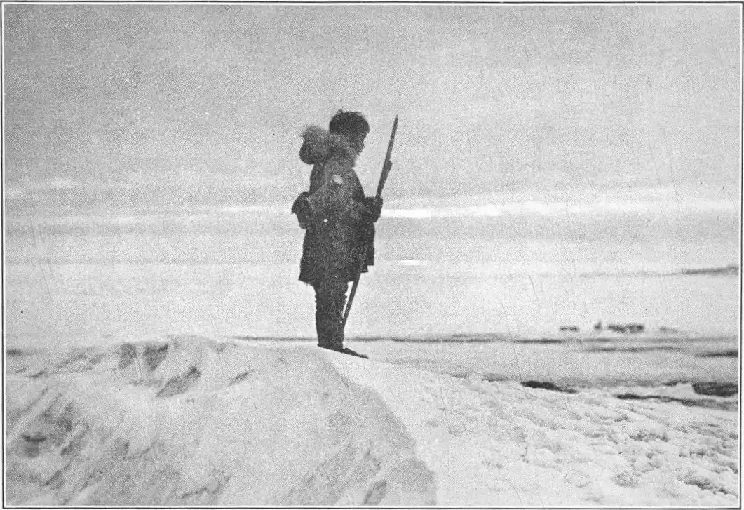 It was the most difficult time of the year just now; the stores of meat accumulated during summer had been used up, and it was a question of procuring fresh supplies for men and dogs, from day to day. Seal were hunted now either at the breathing holes or in the open water beyond the edge of the ice. The weather was rough and stormy, snow falling every day, and the thermometer rarely above minus 50°C. The days were short, and in order to make the most of them, the hunters set off before daylight and returned after dark. All meat brought in was cut up and distributed at once throughout the camp, and as there was generally no more than would suffice for one day, the arrival of the next instalment was looked forward to with anxiety literally equal to that with which hungry folk look forward to a meal.