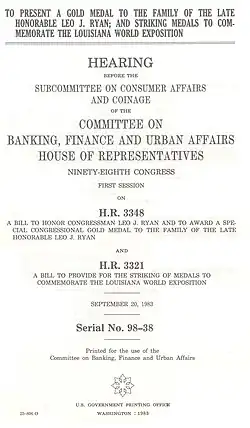 - (a) the President of the United States is authorized to present, on behalf of the Congress, a gold medal of appropriate design to the family of the late Honorable Leo J. Ryan in recognition of his distinguished service as a Member of Congress and the fact of his untimely death by assassination while performing his responsibilities as a Member of the United States House of Representatives. For such purpose, the Secretary of the Treasury is authorized and directed to cause to be struck a gold medal with suitable emblems, devices, and inscriptions to be determined by the Secretary of the Treasury. There is authorized to be appropriated not to exceed $25,000 after October 1, 1983, to carry out the provisions of this subsection.