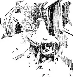 "Merry Christmas, Harriet"—and not waiting for her sleepy reply I go down and build the biggest, warmest, friendliest fire of the year. Then I get into my thick coat and mittens and open the back door. All around the sill, deep on the step, and all about the yard lies the drifted snow: it has transformed my wood pile into a grotesque Indian mound, and it frosts the roof of my barn like a wedding cake. I go at it lustily with my wooden shovel, clearing out a pathway to the gate.