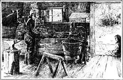 At one side of the forge you will see the great dusty bellows and you will hear its stertorous breathing. In front stands the old brown anvil set upon a gnarly maple block. A long sweep made of peeled hickory wood controls the bellows, and as you look in upon this lively and pleasant scene you will see that the grimy hand of Carlstrom himself is upon the hickory sweep. As he draws it down and lets it up again with the peculiar rhythmic swing of long experience—heaping up his fire with a little iron paddle held in the other hand—he hums to himself in a high curious old voice, no words at all, just a tune of contented employment in consonance with the breathing of the bellows and the mounting flames of the forge.