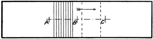 Taking first the case of a gas obeying Boyle's law, i.e., constant; the mean pressure of the whole of the space can undergo no change, for is constant for each small element throughout the region, and the integration of being constant (since the whole mass of fluid in the enclosure is unchanged), the integration of throughout the enclosure is also unchanged. Now it by no means follows that the mean pressure throughout the region is the same as the mean pressure on the walls of the enclosure; in fact, we know from hydrodynamic principles that in many cases of fluid motion it is not so. In the case in point, however, it is manifest that the mean pressure is the same whether the integration is taken over the surface or throughout the volume, for (Fig. 160) the pressure on the walls of the box is point for point the same as for any surface parallel to these walls passing longitudinally through the region, and the pressure on the ends is of the same mean value, for the velocity of sound can be correctly computed on this basis.[11] It is therefore evident that for a fluid obeying Boyle's law the existence of wave motion does not give rise to any change of pressure.