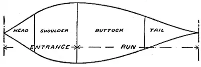 § 11. The Transference of Energy by the Body.—It is of interest to examine the question of the transference of energy through the streamline body itself from one part of the fluid to the other. For the purpose of reference the different portions of the body have been named as in Fig. 4, the head, the shoulder, the buttock, and the tail, the head and shoulder together being termed (as in naval architecture) the entrance, and the buttock and tail the run. The dividing line between the entrance and run is situated at the point of maximum section, and the dividing line between the