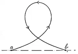 Rankine closely studied the streamlines of a body of oval form, generated by a certain method from two foci (§ 77), and by calculation arrived at the equation to the orbit motion of the particles. The result gives a curve whose general appearance is given in Fig. 6 (actual plotting), in which the arrows represent the motion of the particle, the direction of motion of the body being from left to right. Discussing the particular case in which the eccentricity of the oval vanishes, and the form merges into that of a circle. Rankine says,—". . . The curvature of the orbit varies as the distance of the particle from a line parallel to the axis of X, and midway between that axis and the undisturbed position of the particle. This is the property of the looped or coiled elastic curve; therefore when the water-lines are cyclogenous the orbit of each particle of water forms one loop of an elastic curve." Further, he says—"The particle starts from a, is at first pushed forward, then deviates outwards and turns backwards, moving directly against the motion of the solid body as it passes the point of greatest breadth, as shown. The particle then turns inwards, and ends by following the body, coming to rest at b in advance of its original position."
