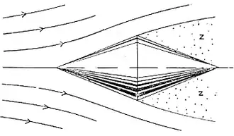 In the practical shaping of a streamline body it is found essential to avoid corners or sharp curves in the line of flow. Bodies in which due precaution is not taken in this respect offer considerable resistance to motion, and the regions of abrupt curvature give rise to a discontinuity in the motion of the fluid. Thus Fig. 7 represents a double cone moving axially, and it will be noticed that the flow has not time to close in round the run, as it would do in a properly formed streamline body, but shoots past the sharp edge, as indicated in the figure. The region in the rear of the body, Z, is filled with fluid that does not partake of the general flow, and which is termed dead-water.
