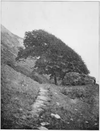 Evidence of the most striking kind of the existence of a surface of discontinuity is sometimes met with in the growth of trees in the immediate vicinity of the edge of a cliff (Fig. 21). It may be seen that the form of the surface is clearly delineated, the tree top being cut away as though it might have been sheared off by a stroke of a mighty scythe.