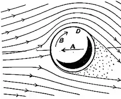 direction of motion of the surface of the ball is the same as the relative motion of the fluid, as at D, the surface will assist the stream in ejecting the dead water, so that the discontinuity will be delayed, and will only make its appearance at a point some distance further aft than usual. On the other hand, on the side that is opposing the stream the surface of the ball will pump air in, and so assist the discontinuity, which will make its appearance prematurely. The net result of this is that the counterwake will have a lateral component (downwards in the figure), and, on the principle of the continuous communication of momentum, there will be a reaction on the ball in the opposite direction, that is to say upwards.