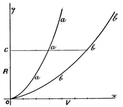 § 41. Resistance-Velocity Curve.—Let us suppose that a curve (Fig. 28) represents by its ordinates the resistance of a body of some particular geometrical form for different values of (abscissae), which we may suppose have been determined experimentally; then if be the curve for some other body of the same geometrical form but of different linear proportions, we shall, by the law of corresponding speeds, have for every given value of that is to say, the proportion is everywhere constant and the two curves are similar in relation to the axis of Also we have the relation in the inverse ratio of the respective linear dimensions, so that a single curve may be employed to represent the velocity-resistance relation of any given geometrical form, the velocity being read to a scale varying according to the linear dimension of the body, so that the diameter or some other definite linear dimension of the body is some definite and constant multiple or submultiple of the scale unit employed. Thus, if the curve be plotted for a one foot diameter circular plane and one foot per second velocity is represented by one inch, then for a two foot circular plane a one foot per second velocity will be represented by two inches, that is to say, a given pressure will be developed at one-half the velocity.