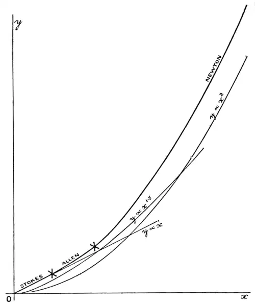 It appears that there is a small departure from the exact expression given, both in the second stage (as found by Mr. Allen) and in the third stage. In the latter case we may suppose that when the velocity becomes very great the geometrical form of the lines of flow becomes sensibly constant, and such resistance as is due to viscosity will then vary as the velocity, the net resistance curve being thus the sum of the ordinates of a parabola
