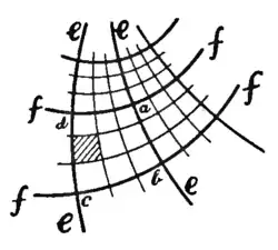 - ↑ Referring to the diagram to the right of Fig. 39, we have from geometrical considerations the normals g and j respectively proportional to the sides of the parallelogram h and k.