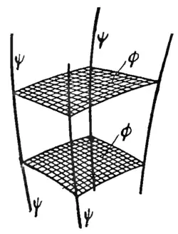 When the motion takes place in three dimensions, the lines and surfaces still divide the fields into a number of rectangular elements, or cubes (Fig. 34), but the conjugate property no longer exists; the functions are not interchangeable.
