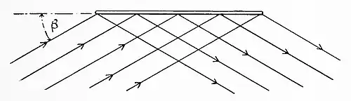 § 160. The Newtonian Theory Modified; the Hypothesis of Constant “Sweep.”—In the theory of the Newtonian medium, for a given velocity the mass of fluid dealt with is proportional to the sine of the angle </math>\beta ;</math> in a real fluid it is evident that the particles cannot cross each other's paths as depicted in Fig. 92, but will be constrained to move in a congruent manner. Thus if one layer be supposed to strike the plane and follow its surface, the next layer will be in turn deflected and move parallel to the first, and so on. If the particles of fluid were artificially constrained so as to be unable to undergo any change of velocity along the axis of flight, or to spread laterally, this influence would be transmitted from layer to layer with undiminished amplitude, or in the case of an elastic fluid until the initial displacement had been absorbed by compression.
