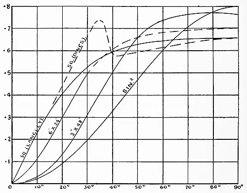 In Fig. 93, in which ordinates represent the relative pressure on the plane for all angles from degree 0 to 90 degrees, we have curves plotted as follows:—