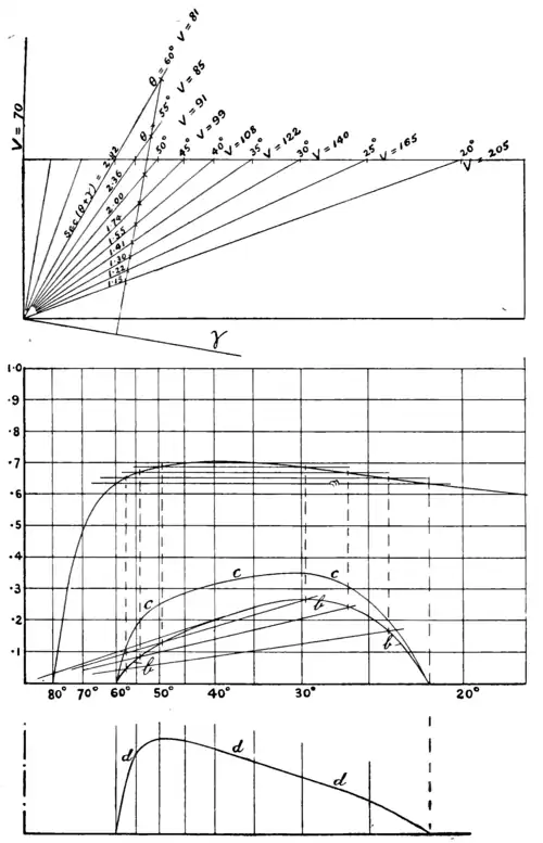 which we may express in another way and say: The angle of greatest efficiency is 45 degrees, minus half the least gliding angle.[3]