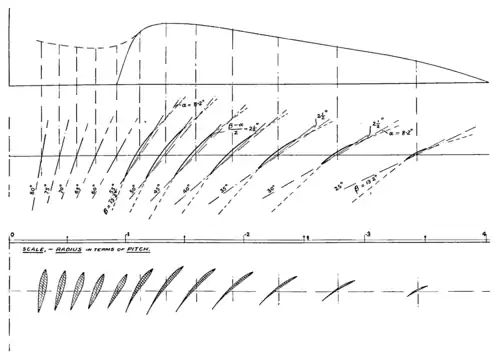 It should be remembered that the spiral is at every point the analogue of the horizontal line, and the one from which the angles are laid off; on this basis the setting out of the section is the same as for an ordinary aerofoil, but the full "dip" forward can be given to the section, since the possibility of the loss of equilibrium is no longer a factor (§ 138).