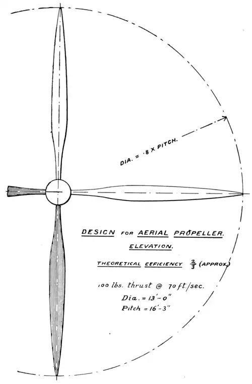 (8) All that remains to be done is now to give a scale to the design that will render the propeller suitable for the intended load. To this end any convenient scale should first be assumed and the load calculated, for the actual value of (the velocity of flight), which it is intended to employ. The linear dimension will then be in the ratio to the dimension required as the square root of the calculated thrust is to the square root of the thrust required. That is to say, the scale unit will be in the inverse ratio.