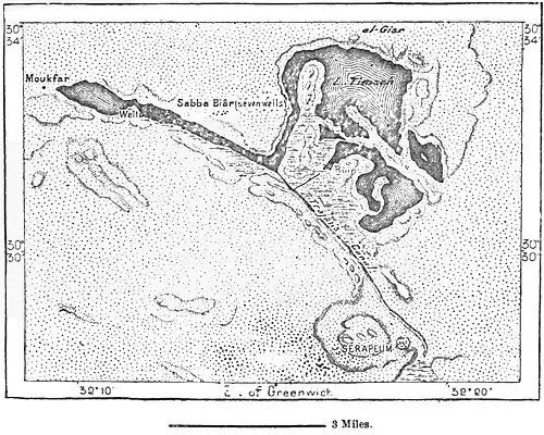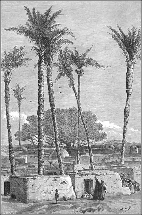 wars with Assyria required the centre of gravity of the kingdom to be shifted more towards the east. Broken shafts and sculptured blocks still scattered about attest the former splendour enjoyed by this now ruined city. North-east of it, on the very verge of the wilderness and on the last irrigating canale derived from the Nile, lies the village of Karaim, surrounded by palm-groves which have the reputation of yielding the finest dates in Egypt.