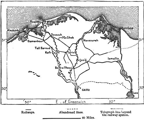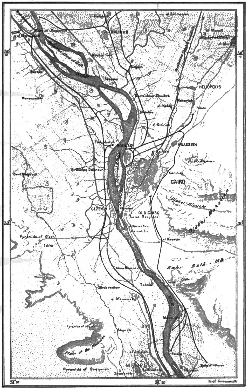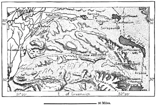 Before the opening of the Suez Canal, Cairo was connected with its port on the Red Sea by a direct line of railway, crossing the desert through the depressions followed by the ancient pilgrims’ route. The present seaport of Suez, lying at the