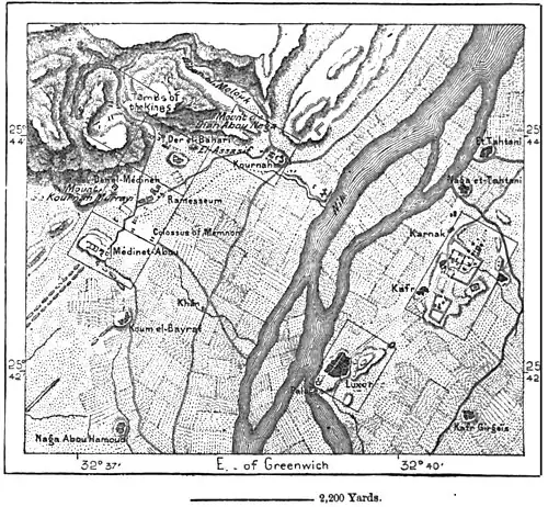 The Thebes of the left bank was rather a city of the dead than of the living. Nevertheless the portion of the plain where the ground begins to rise towards the Libyan escarpments also abounds in monuments, mostly, however, of a sepulchral