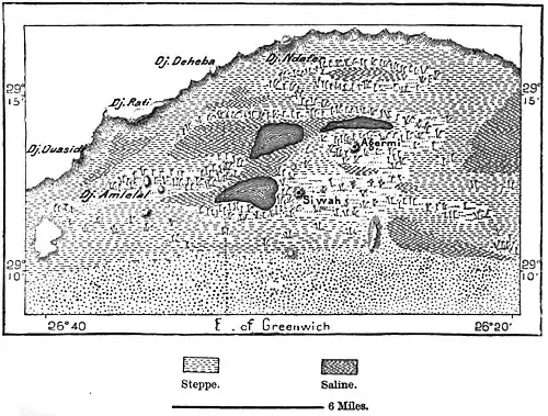 The Bakharieh Oasis, lying nearer to the Nile Valley and being better supplied with springs than Farafreh, is also far more densely peopled. This is probably the "Little Oasis" of the ancients, and here are still to be seen a few monuments dating from the Roman period, including a noble triumphal arch, some underground aqueducts and fortifications. Siwah — Gara.