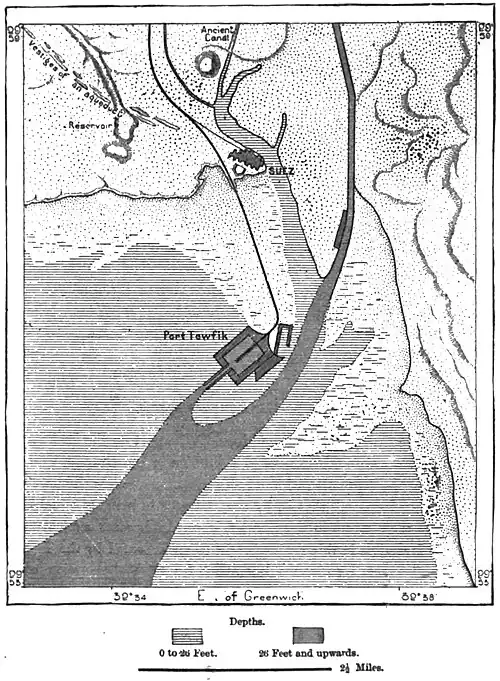 Nevertheless even in its present unfinished state the barrage of the Nile is by no means an altogether useless work, the lamentable monument of an aimless prodigality, as it has been so often described. It serves at least every year to raise by 6 or 7 feet the water level of the main stream. According to the English engineer Fowler, a farther outlay of about one million sterling would be needed to raise the level by 16 feet, as originally intended, to strengthen the foundations, and complete the system of canalisation. But at the same time it would be also necessary to modify the original plan, in order to prevent the constant accumulations of sedimentary matter above the barrage, or else construct navigable canals along this section of the Nile. Suez.