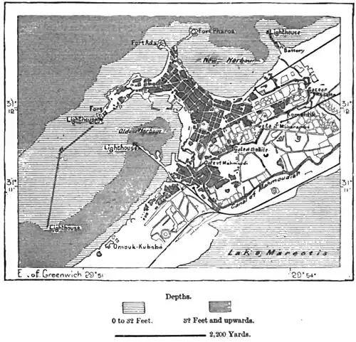 Arrivals 738 vessels of 20, 1 24 tons. Departures 726 ,, 19 717 „ Total . 1,464 „ 39.841 „ DAMANAUUR—KiVFR-DWAR—CANOPIS— ABUKIR. 427 by canals derived from the main stream. Hero the plains are irrigated by the Mariut, Abu-Dibat, Damanahur, and Metmudieh Canals, with innumerable smaller channels, all of which discharge their waters into Lakes Mariut and Edku. Damanahur — Kafr-Dwar. Damanahur, consisting of a group of numerous hamlets, is the capital of this region of arable lands, where the tall chimneys of the cotton-cleansing factories almost out- number the minarets of the mosques. Between Damanahur and Alexandria this part of the delta is connected with the seaboard by a narrow isthmus, where road, railway, and canal arc all alike protected by embankments against the waters of liakes Abukir and Mariut. This strip of land is one of " the gates of Egypt." Accordingly during the late military insurrection Arabi Pasha caused the approaches from this direction to be blocked from bank to bank by the Kafr-Dicar embank- ments. Instead of forcing these lines the English General Wolseley took them in flank and roar by suddenly embarking his forces and re-landing them at Ismailia on the Suez Canal, whence be advanced into the heart of Egypt by the opposite gate of the AVady-Tumilat. The success of this mana?uvre was complete. The formid- able Kafr-Dwar lines became useless, and Arabi was compelled hastily to withdraw his army to defend the approaches from the Suez Canal, this movement being followed by his crushing defeat at Tell-el-Kebir. Canopis — Abukir. North of the Kafr-Dwar isthmus Rosetta is connected with the peninsula of Alexandria by another belt of narrow land, which is also utilised by a line of rail- way, and which passes by the little dune-encircled town of Edku, or Edko. At the outlet of Lake Abukir the Maadieh, that is to say, the ford or passage, indicates the course of the ancient Canopic branch of the Nile, the most westerly of all the (ieven fluvial ramifications. Cauopin, whence this branch took its name, has left only some doubtful remains on a 8|X)t frequently washed by the surrounding waters. Throughout the whole of the maritime tract adjacent to the Maadieh ford, the sands have swallowed up the sites of ancient structures, which have also served to supply materials for building the neighbouring villages of Mandarah, Abukir, and others. Abukir, situated on the shore of the bay to which it gives its name, probably on the very spot formerly occupied by the town of Zephyrion and the temple of Arsinoe Aphrodite, is a small but busy seaport, far better known, however, for its historic associations than for its local trade. It was in the Abukir waters that in the year 1798 Nelson destroyed the French fleet, thereby cutting off all communi- cation between the conquerors of Egj-pt and the mother country. And although next year Bonaparte was still strong enough to annihilate a Turkish army which 428 NORTH-EAST AFRICA. had disembarked at this place, the fruits of Nelson's famous victory were soon after reaped by the total failure of the expedition, and the surrender of the French forces to the British after the battle of Alexandria. Alexandria. Alexandria, one of the great trading places of the world, and the second city of Egypt and the African continent in size and population, is also one of the most remarkable for the originality of its form. Its outline, however, has been greatly modified since the period when, some twenty-two centuries ago, the obscure town of llhacolis received from the Macedonian conqueror the world -renowned name which it has borne ever since. At this point of the coast the rocky marine belt running in the direction from south-west to north-east has been broken by two wide breaches. Thus was created an island, under shelter of which the fleets of Phoeni- cians and Greeks formerly rode at anchor. Such was the famous island of Pharos, already mentioned in the Homeric poems. When Dinocrates laid out the city of Alexandria on new lines, he did not dispose the temples and palaces along the continental coast-line, which here pro- jected to a point in the direction of the island standing at a distance of over 1,500 yards from the mainland. But Ptolemy Soter, one of the first sovereigns of the Greek dynasty, bridged over the intervening space by means of the so-called " Seven Stadia Embankment," leaving two open channels of communication between the two harbours that were thus created. The channels have been gradually obliterated and the causeway enlarged, partly no doubt in conse- quence of marine deposits, but much more by the action of the Greek and Italian vessels, which throughout the whole of the Middle Ages were accustomed to dis- charge their ballast of stones in the Alexandrian waters. At present the causeway has been transformed to a strip of land over 1,300 yards broad connecting the site of the ancient city with the north-east part of the former island of Pharos. Here is now situated the " Turkish quarter," a labyrinth of irregular and winding lanes, pierced here and there by a few broad modern thoroughfares. The island thus changed to a peninsula has itself become covered with streets, houses, barracks, depots, palaces, and buildings of all sorts. At its 80ith-western extremity stands the lofty tower of the modern lighthouse, the successor of the famous " Pharos " of Ptolemy Philadelphus, a monument of white marble in the form of a step pyramid, which originally stood at the opposite end of the island, and which was regarded by the ancients as one of the " seven wonders " of the world. Masudi, who saw the ruins of this structure, says that in his time it was still " four hundred cubits high," and according to Mahmud Bey it rose to an elevation of over 400 feet. No vestiges are now visible of the light- house, whose very site has been washed away by the marine waters. Nob has the neighbouring fort which bears its name even been construct