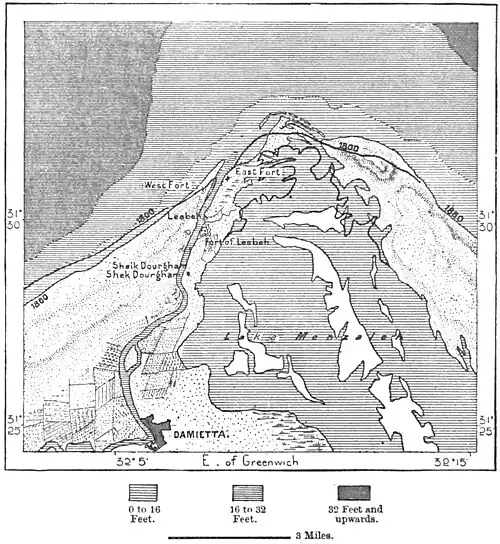 At present two main branches only are enumerated, and these are indicated on the convex curve of the seaboard by two points formed by the tongues of alluvial land advancing continually seawards. They are the Rashid or Rosetta branch, identified with the Bolbitinis of the ancients, and that of Damietta, which formerly bore the names of Phatnetica and Bucolica. The Rosetta branch, some 14 miles the shorter of the two, but flowing in a bed from 30 to 50 inches lower, carries o£E the largest quantity of water, leaving not more than four-ninths to that of Damietta and the intermediate Menufieh channel,[8] Nevertheless the Damietta River, thanks to its greater elevation, is much more available for irrigation purposes. The two branches, diverging like the radii of a circle, flow respectively north-west and north-east, advancing at their mouths some 5 miles beyond the normal coast-line. But, like all rivers falling into the Mediterranean, both are half closed by mud and sandbanks, barring the passage to large vessels. The western or Rosetta River has two channels from 7 to 8 feet deep, while that of Damietta, being less open, has a depth of scarcely 65 inches at its entrance. At high water, when there is a discharge of 470,000 cubic feet per second, the bar is reduced not more than 4 or 5 inches, its elevation depending more on the action of the marine currents than on the inland floods. But if its height is little modified, its position is often shifted several miles. During the inundations the current of the Nile is felt 3 miles seawards, and at times is strong enough to perceptibly reduce the violence of the waves, thus offering a temporary refuge to storm-tossed vessels.
