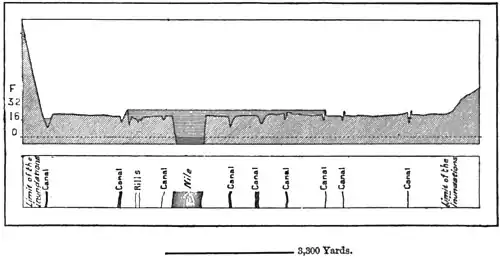 sacrifices, . mm The two zones of alluvial land skirting the Nile are intersected by numerous irrigation canals, which distribute the fecundating waters far and wide. Like those of other streams flowing through alluvial plains, the banks of the river are higher than the surrounding country. A cutting running transversely to the direction of the valley would show that from cliff to cliff the plain presents the form of a convex curve, so that at high water the stream occupies the most elevated level between the ranges of hills bordering both sides of its valley. From this central elevation the surface of the current inclines right and left, and the slope is continued in both directions across the riverain plains. This disposition of the ground is due to the greater quantity of sedimentary matter deposited along the banks of the stream. The waters have thus a double incline, that is, according to the general direction of the river valley, and according to the lateral slope of its banks. If they met with no obstacle in the irrigating canals, they would flow at once to the lowest level on either side, and convert the whole depression into a vast lake. Hence they have to be retained at the higher elevation by means of a transverse dyke, which is opened only when the upper levels have been sufficiently submerged. The overflow is then arrested in a second section also confined by embankment works, and in this way the water is distributed to every part of the surrounding plains by a system of canals disposed at successive levels.