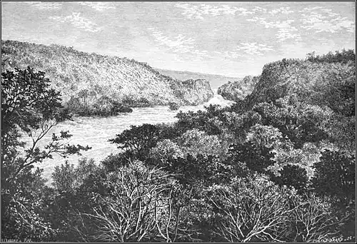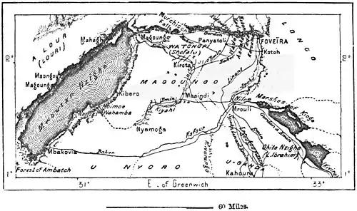 Masimli, on a river flowing to Lake Albert, was the residence of the king of U-Nyoro when the country was first visited by Speke, Grant, and Baker. But in 1877 it was replaced by Nyamoga, which is also conveniently situated in the centre of the region enclosed between the lake and the great bend described by the Nile below M'ruli. The latter place, which occupies an important strategic and commercial position on the Nile at the converging point of the caravan route from U-Ganda, has ceased to be the advanced southern outpost of the Egyptians. Even before the Mussulman revolt in Dar-For the troops had been withdrawn from M-ruli and from Kirota, which lies in a forest clearing farther north-west. The western bulwark of the Khedive's possessions is, or was till recently, Foweira (Fawera, Fauvera, Faveira), whose site has been shifted to a cliff on the east bank of the Nile near the Kubuli confluence, and not far from the point Avhere the river trends westward to Lake Albert. North of the river stands another fortified station near the Karuma rapids, and north of Panyatoli, residence of one of the most powerful Wa-Nyoro chiefs. A third Egyptian fortress in U-Nyoro is Magunugo, on the right bank of the Nile, where its sluggish, current joins Lake Albert. Being enclosed by a ditch ten feet broad, this place is impregnable to the badly armed and undisciplined troops of the Lango or Wa-Nyoro chiefs. East of Magungo steamers ascend the river as far as the wooded gorges of the Murehison Falls.