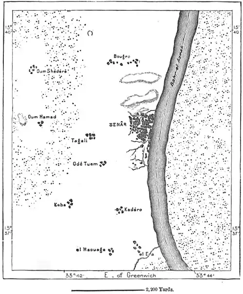 At some distance from the river, near the ruins of the village of Arbaji, destroyed by the Funj, stands the town of Messalamieh, in the midst of fields of durra, a strong place which the insurgents took from the Egyptians after a long and murderous siege. Before the war it had become a considerable market, precisely because it was distant from the river, so that the nomads had here to fear the passage of armies less than in towns lying on the banks of the Nile.