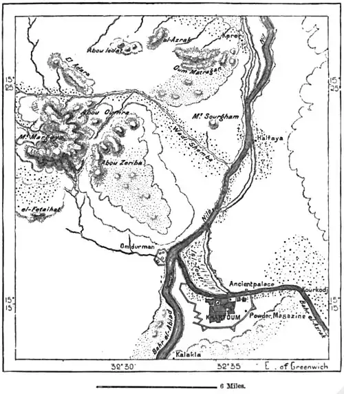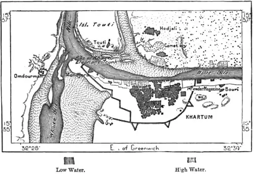 Typhus has often more than decimated the population; but in winter the atmosphere is purified by the north winds and the public health is as good at Khartum as in any other African city. After a vigorous defence maintained for upwards of two years against overwhelming numbers, Khartum was betrayed to the Mahdi on January 26th, 1885, when its heroic defender. General Gordon, and the Egyptian garrison, with nearly all the Christians still in the place, were massacred. This tragic event occurred only three days after the arrival at Metammeh of the advanced division of the British expedition, organized by General Wolseley for the relief of the place in the autumn of 1884. Thus the primary object of the expedition was defeated, and Khartum became for some time the centre of the Mahdi's power in the Upper Nile regions.