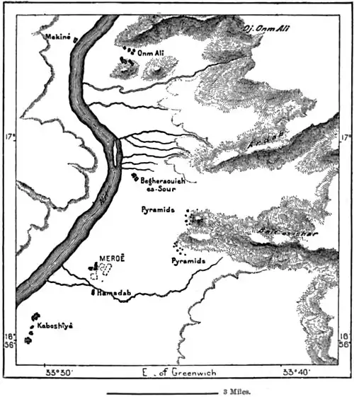 About 12 miles north of Naga, in a desert valley, is a labyrinth of ruined buildings and refuse which the Arabs have named Mesaurat. The central building, whose ruins are still visible, is one of the largest known edifices, being 2,900 feet in circumference; its columns, fluted and sculptured, but without hieroglyphics, are evidently of Greek architecture, and whilst Cailliaud thinks it was a priest's college, Hoskin imagines it to have been a royal country seat. The remains of the town in which Cailliaud recognised in 1821 the ancient Meroë, "capital of Ethiopia," stand 30 miles below Shendi, a few miles from the right bank of the Nile; in the midst of these ruins are scattered a few villages, amongst others that of Es-Súr, which gives its name to the tarabil, or pyramids. The pylons, temples, colonnades, avenues of animals and statues are still standing; but the sandstone of Meroë, excavated from the neighbouring quarries, is not so durable as that of Egypt. The pyramids, to the number of about eighty, are