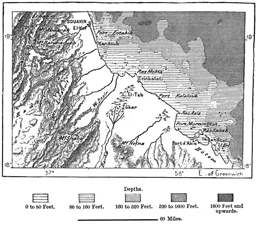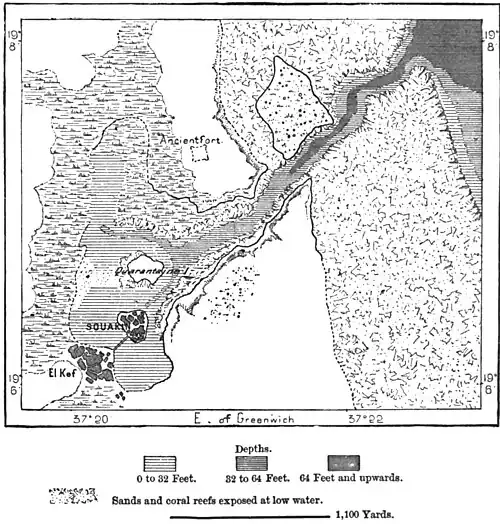 Suakin, or Sawakin, is the safest port on the Red Sea coast, and resembles that of Massawah in its geographical position. The riverain zone of coral banks is pierced by a winding channel which penetrates over 2 miles inland, terminating in an oval-shaped basin about 1 mile from north to south. To the west are sand-banks which contract the sheet of water, and are continued by shallows overgrown with reeds. Two round islands, partially fringed with rocks, exceed the level of the basin by several feet. One of these islands, that of Sheikh Abdallah, is used exclusively as a cemetery; the other, farther south, comprises the town of Suakin, properly so-called. The chief port lies between these two islands, but vessels of the heaviest tonnage can also anchor north of the island of Sheikh Abdallah; in this species of lake, which seems to be surrounded by land on all sides, vessels are perfectly safe from the winds and surf. The port, opened in the midst of a beach rendered very dangerous by the multitude of reefs, is well worthy the name of the "harbour of the protecting gods," which many authors believe to have been given it during the time of the Ptolemies.