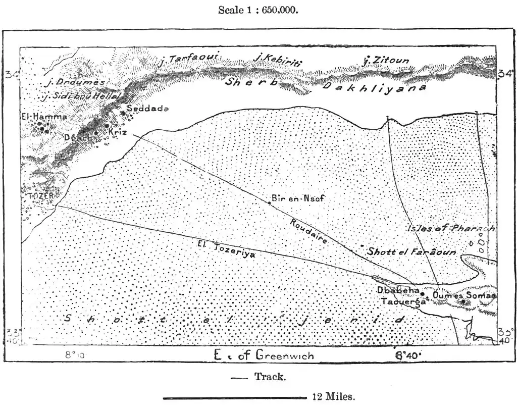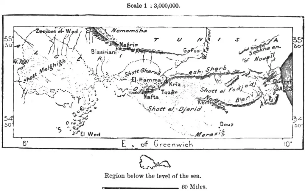 Shaw, towards the end of the eighiteenth century, was the first to put forward the hypothesis that Lake Triton was identical with one of the Tunisian sebkhas. As a zone separating two natural regions, two faunas, and two races, and from a hydrographical point of view appealing to the imaginition both by its vast size and by its divers phenomena, this region ought to prove of much greater interest to geographers than the little lake on the eastern coast, north of the islands. The vast basin of the Igharghar, whose waters formerly flowed into the chain of "Tritonic " lakes, presents a surface of at least 320,000 miles, forty times superior to that of the Tunisian weds which run into Lake Kelbia. This basin, however, has been completely separated from the Mediterranean for a period long antecedent to all historic records.