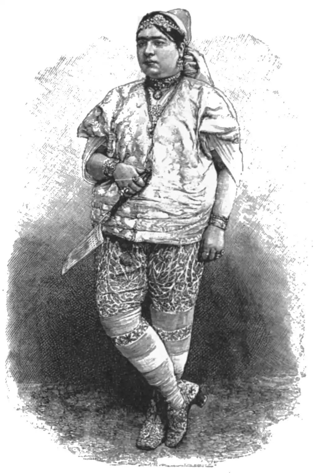In proportion to the Mohammedan population, the Jews are more numerous in the regency of Tunis than in Algeria. They are grouped together in important communities, not only in the city of Tunis, but also in the other towns of the coast and in Jerba Island. Many of these Israelites are the descendants of Jews settled in the country before the conquest by the Arabs, and it may be asked whether these families, till recently looked on with contempt, do not contain some elements of the ancient Carthaginian masters of the Fig. 40. — Tunisian Jewess.