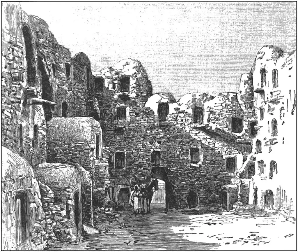The town itself has left but few ruins, but excavations have brought to light columns of vast size, and deep cisterns. According to M. Rouire, the nomads of this region are gradually displacing the settled populations. Every village deserted by its inhabitants is immediately seized by the native Beduins, who make it their chief market and remove thither the shrines of their saints.