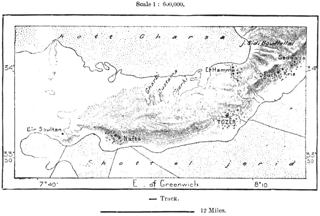West of Nefzawa, on the other side of the Sebkha-el-Faraun, rise the hills of the narrow isthmus which is known by the special name of Belad-el-Jerid, "Country of Palms," or merely as Jerid, i.e. "The Palm Grove." a designation often extended to the whole region of the southern oases. The Jerid is, in fact, pre-eminently the date country. Surrounded as it is by shotts and sands, and protected from the north wind by the mountains which rise to the north-east, the Jerid undoubtedly possesses that "fiery air"? which is so essential to the life of the palm. Thanks to its abundant springs, it can supply these trees with all the moisture they require; while the water, slightly warmer in temperature than the atmosphere,