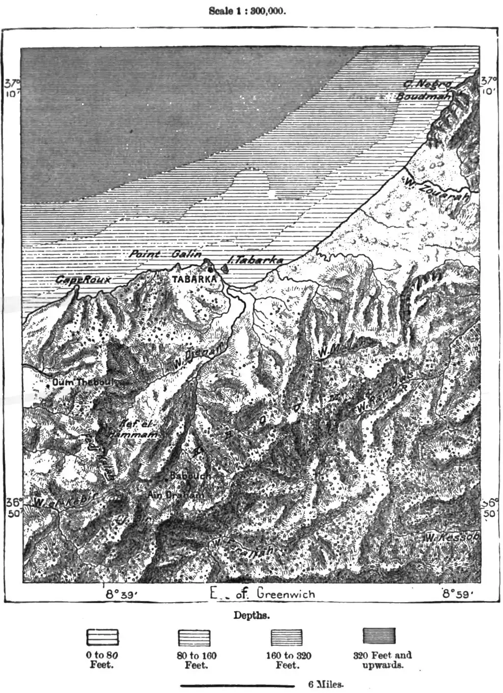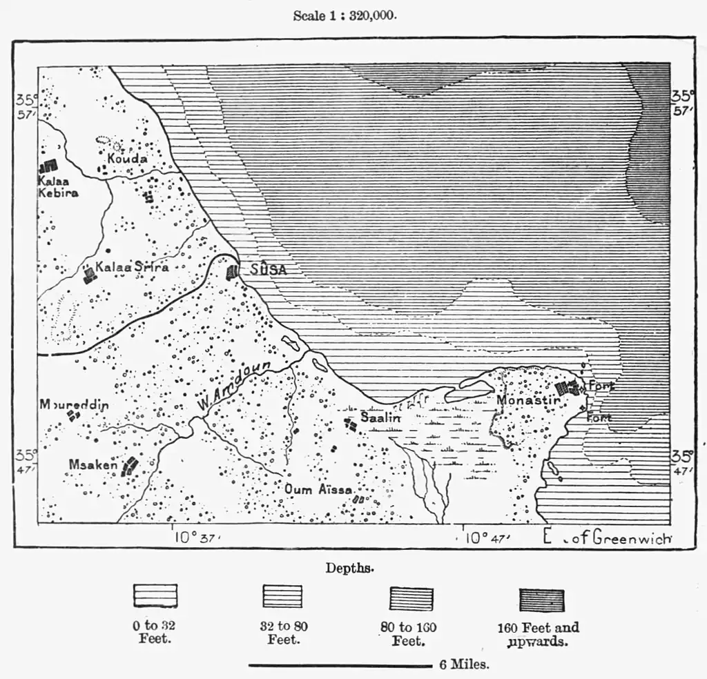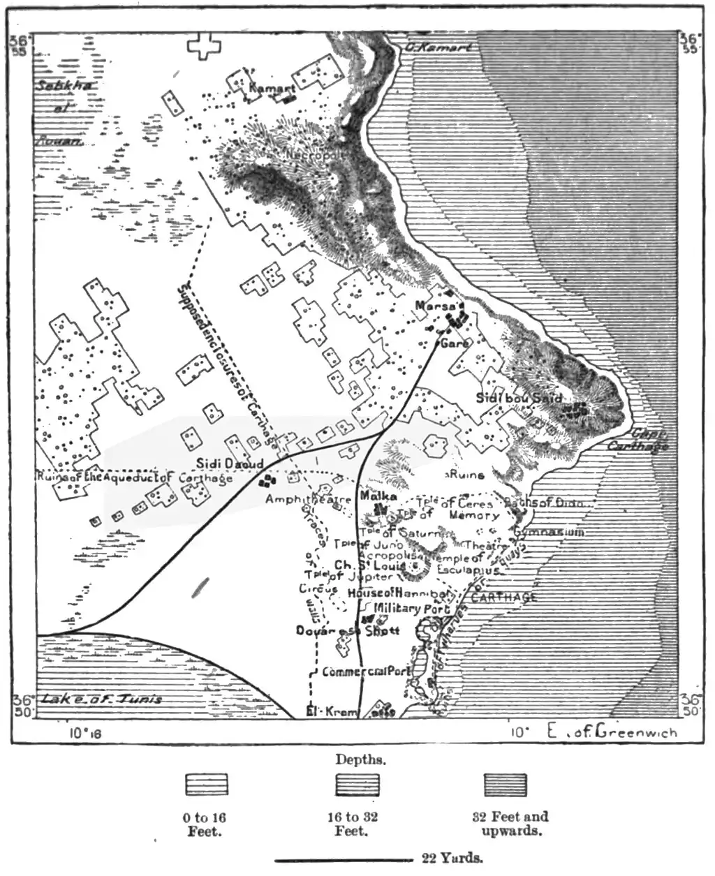 Not far from the promontory, of which Monastir occupies the western angle, is a small group of islands, one of which is pierced with some fifty artificial grottoes, probably of Phœnician origin. They recently served as places of shelter to the tunny-fishers, and have occasionally been used as places for keeping sailors and travellers in quarantine. Farther east, the group of Kuriateïn Islands which is connected with Cape Dimas by a submarine bank, is, according to Tissot the remnant of a considerable tract of land, which was still in existence at the Punic period; however, the documents on which this hypothesis is founded are not definit enough to lend much value to the statement.