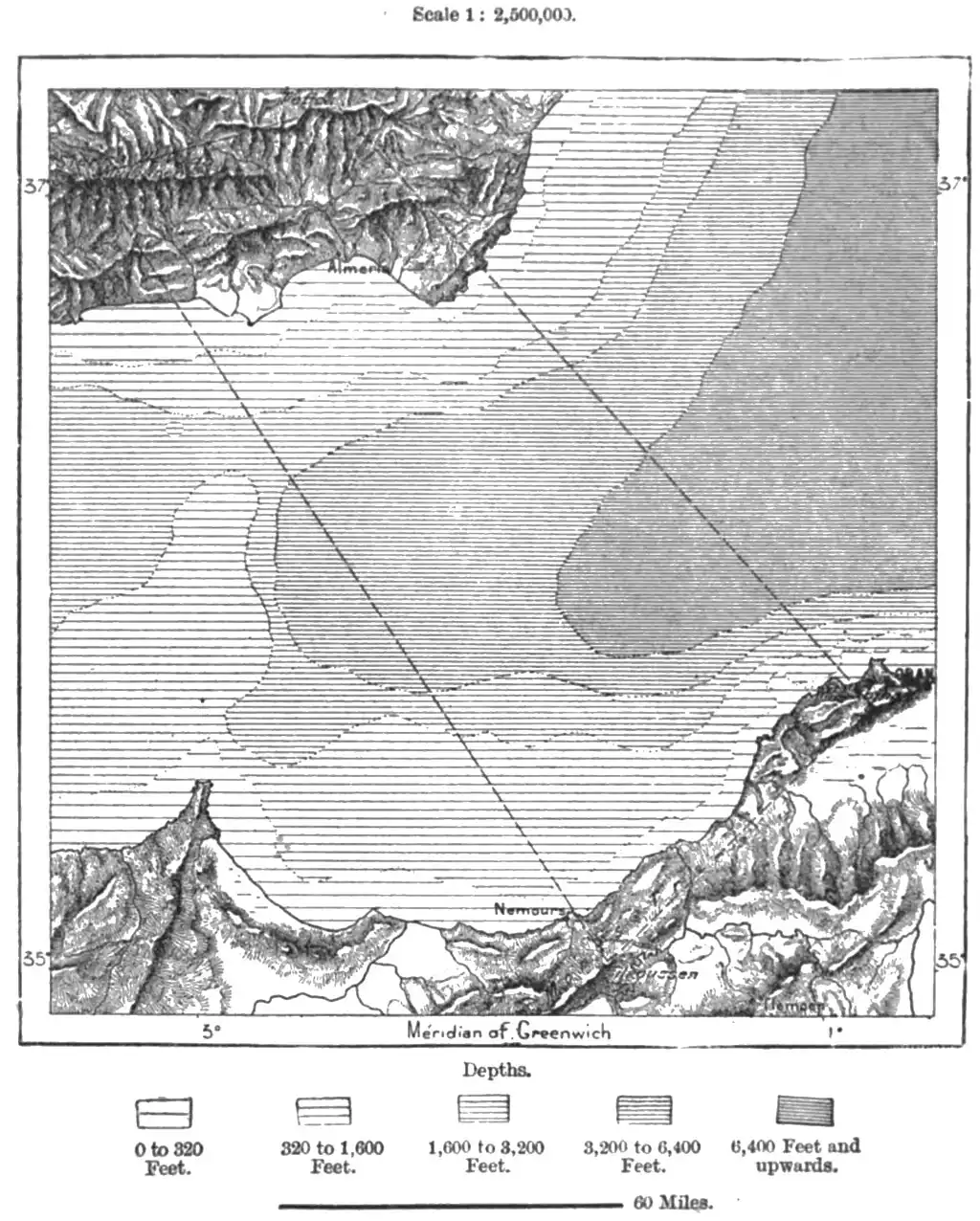 In the western province of Oran the prevailing formations are Jurassic, which also form the chief strata throughout the plateau. In the east especially, these rocks underlie the chalk, which in its turn is overlaid in the north by Miocene and Pliocene formations. Alluvia of various epochs, and of vast depth, occupy the river valleys, and in a great part of the plateau cover both the Jurassic and cretaceous rocks. The Triassic and older schists are represented by a few isolated 204 NORTH-WEST AFRICA. masses, while in the neighbourhood of the coast granitic peaks crop out above the surrounding Miocene layers. Gneiss prevails on the northern slopes of the Jurjura, and the headlands projecting seaward consist largely of trachytes and basalts. Minerals, marbles, gypsum, salt, and thermal springs occur in many places, constituting for Algeria a considerable reserve of future wealth. According to M. Bourdon the coast near the mouth of the Shelif shows signs of upheaval. Thus the cliffs near Karuba and at other points are disposed in distinct terraces or beaches, strewn with shells of the same species as those of the surrounding waters. The coastlands are also subject to frequent earthquakes, the offects of which have been felt in Oran, Tenes, Algiers, and other towns. Many of the headlands consist of eruptive rocks, and it seems probable that the whole seaboard, like that of Tuscany and Naples, follows a line of fault in the terrestrial crust. In few regions are the traces of former erosion more evident than in Algeria ; but it is difficult to say whether they are to be attributed to the action of running waters or of snows and glaciers ; for there can be no doubt that Algeria also had its glacial period, of which clear indications are still visible on the northern slope of the Jurjura range. The work of erosion is still going on incessantly, especially in the Dahre district, where the hills are formed of a compact mass of very argil- laceous white clay, without any appearance of stratification. Similar phenomena are also very active south of the Shelif Valley, in the argillaceous and marly hills skirting the plateau. But the crests are here crowned with sandstone laj'ers from 30 to 130 feet thick, which resist atmospheric influences much longer than the underlying strata. North of the Sahara the great Algerian quadrilateral, consisting almost exclusively of plateaux and highlands, nowhere presents any conspicuous heights dominating the surrounding masses. The four chief groups of the Warsenis and Jurjura in the north, and the Amur and Aures in the south, are grouped in a sort of symmetrical order, none of them constituting a central nucleus distributing the running waters in well-defined basins. Thus no river valley is found which, by its exceptional fertility or favourable position for intercourse, might have become a natural centre of attraction for the whole country. Hence Algeria is divided into as many distinct territories as there are isolated upland regions and river basins, and it is this disposition of the land that has at all times rendered its conquest so difficult. At present a centre of attraction denied it by nature is being gradually created by artificial means at the city of Algiers, with its new harbour, routes, and railways radiating in all directions. The Coast Range.s. In the extreme north-west the Trara coast range, whose gorges afford an outlet to the Tafna river, has a mean altitude of less than 1,650 feet, culminating in the limestone peak of Mount Filhausen (3,860 feet), to the south-east of Nemours. From this, as well as from several other summits between Oran and the jyjarocco frontier, a view is commanded in clear weather of the crests of the sierras on the opposite coast of Spain, at a distance of no less than 168 miles. It thus became possible to connect the network of Algerian triangulation with that of the Iberian peninsula without passing through Marocco. The four points chosen for the connecting quadrilateral were Mulhacen in the Sierra Nevada, Tetica in the Sierra de los Filabres, at the south-cast angle of the peninsula, Filhausen in the Trara