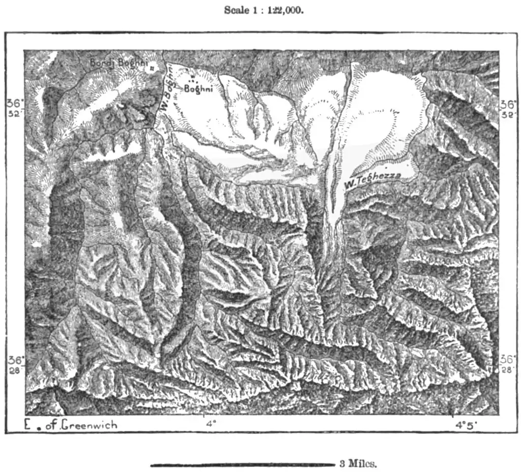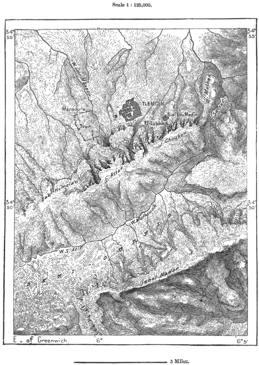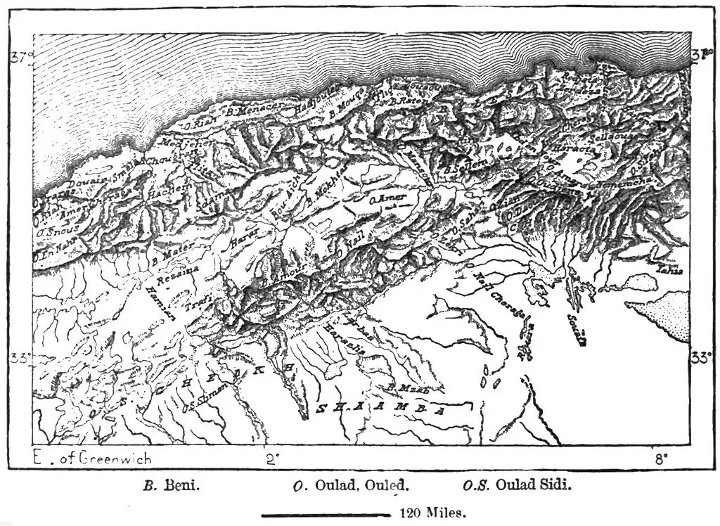 of regard for the prior claims of Marocco. The frontier in this direction is far from clearly marked, no natural line of demarcation having been followed in determining the political confines, which by the treaty of Tangier, in 1844, were laid down at haphazard across mountains, valleys, and tribal districts.