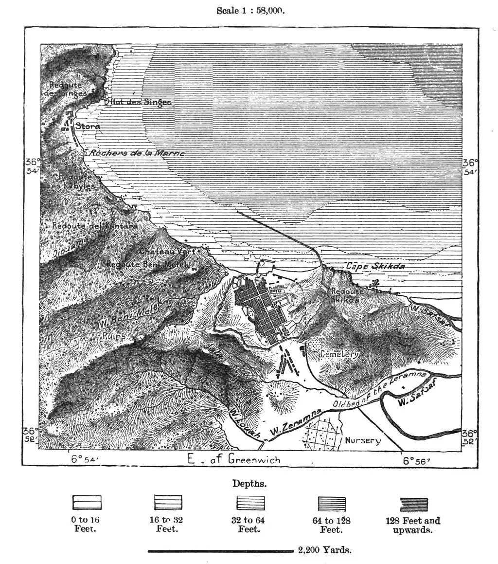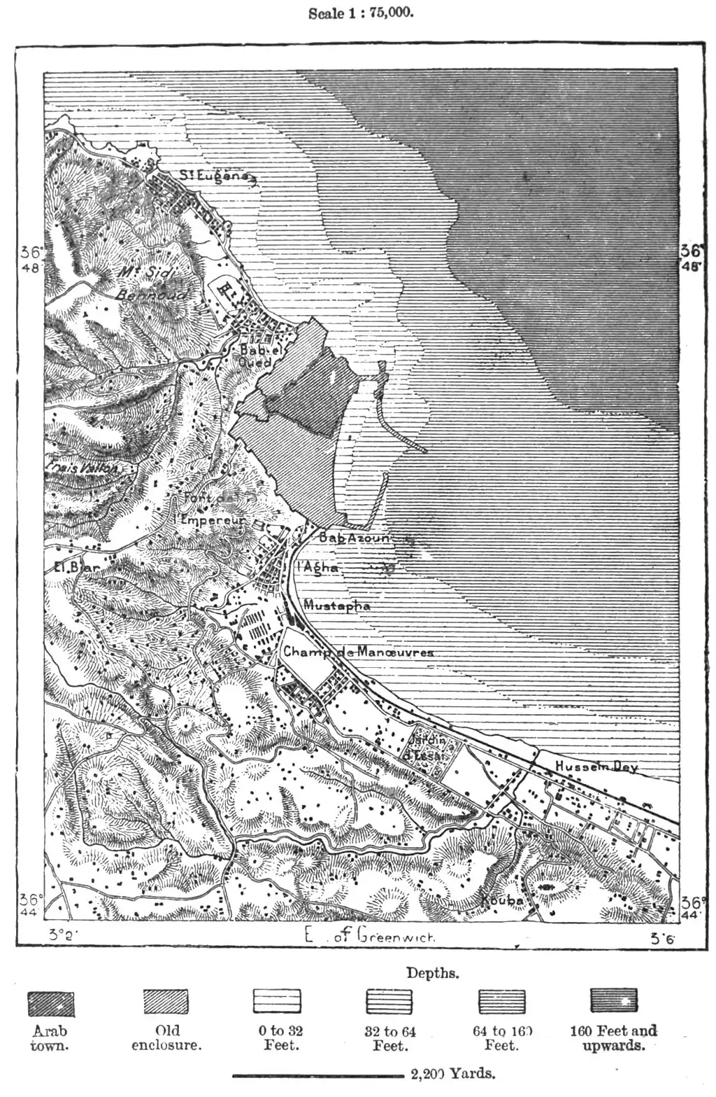 Mediæval times by European mariners, who were protected from oppressive exactions by special conventions. On two occasions, in 1152 and 1535, it even fell into the hands of the Christians, and after its final occupation by the French in 1832, it became one of the chief naval stations on this coast. The present harbour, from 18 to 20 feet deep inshore, occupies an area of about 30 acres; while the outer port, protected from the surf by a pier 2,600 feet long, encloses an additional space of 175 acres. But its growing trade, especially with Algiers, Marseilles, and Tunis, requires further accommodation, and it is now proposed to convert a large portion of the outer harbour into a second basin, lined with quays reclaimed from the sea.