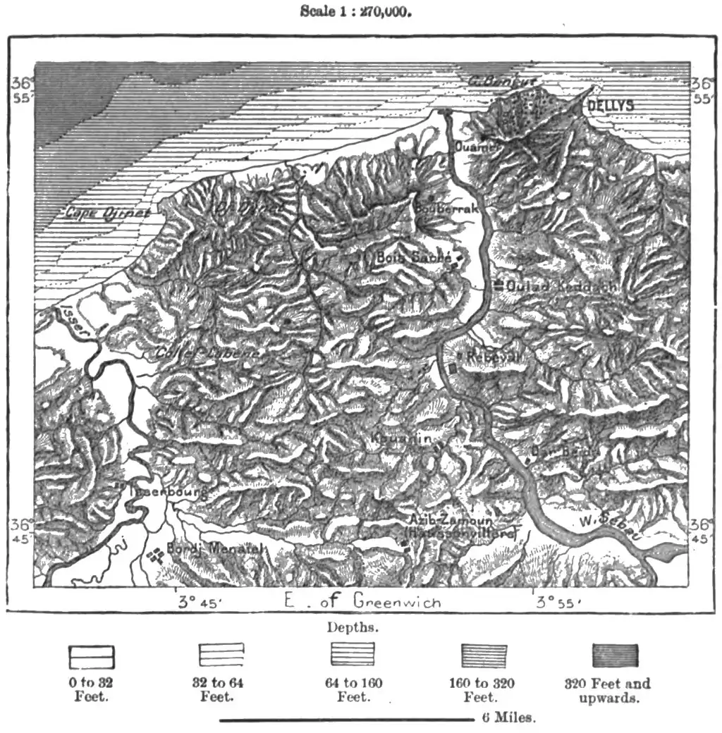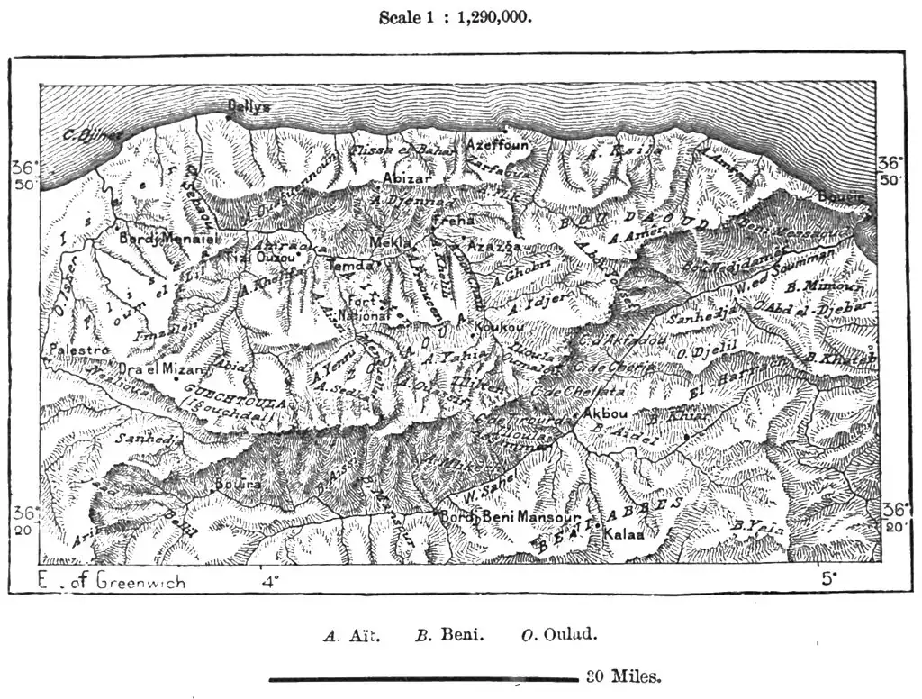 The mountains of Upper Kabylia are disposed in such a way as to form a regular semicircle round the border of this region. Coast ranges, such as the basaltic promontory of Jinet, the limestone Dellys chain, and the crests of Azeffun, complete this extensive orographic system, which is broken only by difficult passes and the route opened in the north-west between the Lower Seban and Isser river valleys. While Great Kabylia from Bougie to Menerville is completely encircled