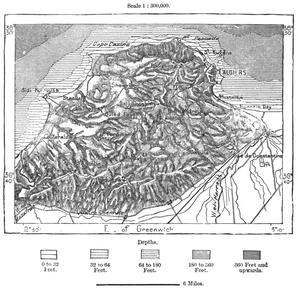 One of the best-defined ranges in Algeria is that of Jurjura, the Mons Terratus of the Romans, which runs east and north-east of the Titteri hills. Although its highest point is only 7,680 feet, or somewhat less than the Sheliya of Aures, it rises to a greater relative height above the plains than any other range in the country. Seen from the north it presents an imposing appearance, being hero skirted throughout its whole length by a deep wooded and cultivated valley, which forms a pleasant foreground to its rugged and snowy peaks. In this direction the snows are more abundant than on the opposite slope, and in the depressions traces