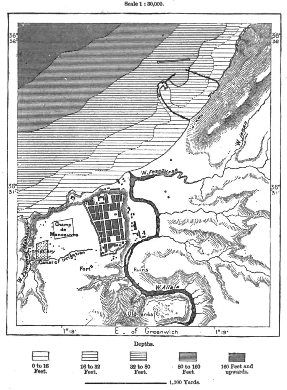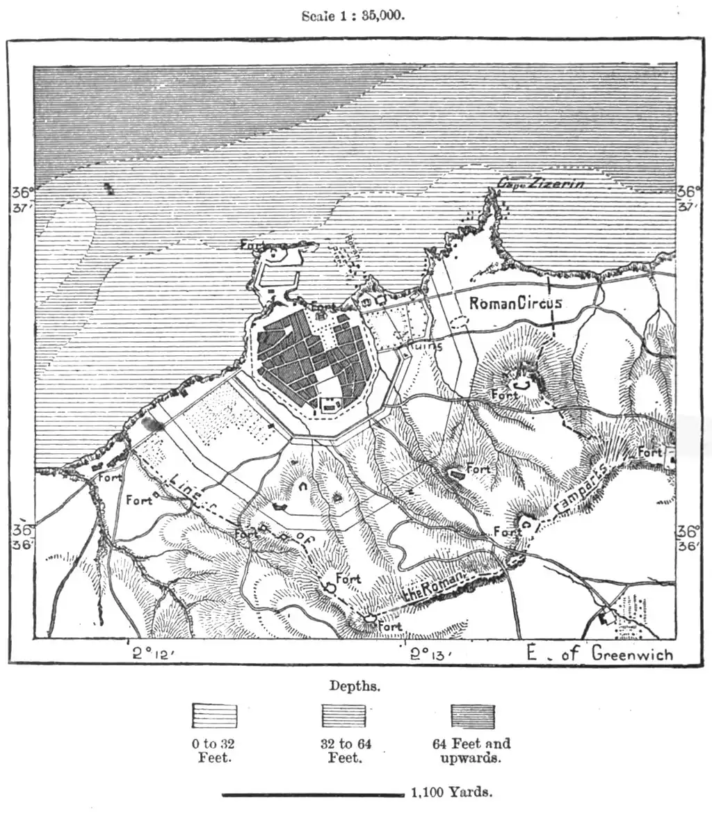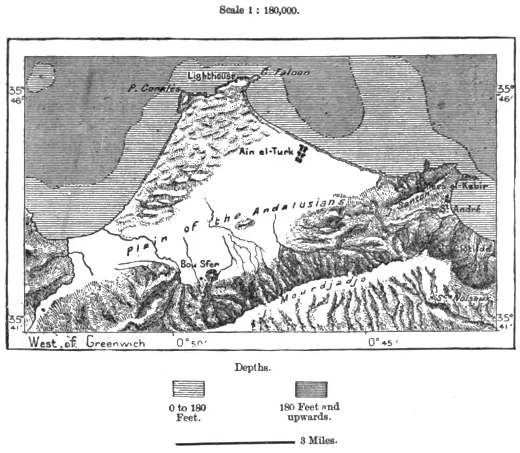 is encircled by steep cliffs, affording no space for a large town. Hence Oran lies at the extremity of the bay, where the hills disappear, leaving a wide opening landwards. From the strategic point of view this breach also offers great advantages, being defended by a natural fortress, adding greatly to the strength of the enclosures.