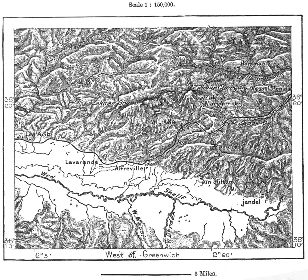 Near the confluence of the Shelif and Wed Riu stands the large village of Inkermann, while the neighbouring Mount Guezzul (3,580 feet) is occupied by Tiaret (Tiharet, Tihert), which in 1843 succeeded as capital of the district to Takdemt, or New Tiaret, chosen by Abd-el-Kader in 1886 as the central stronghold