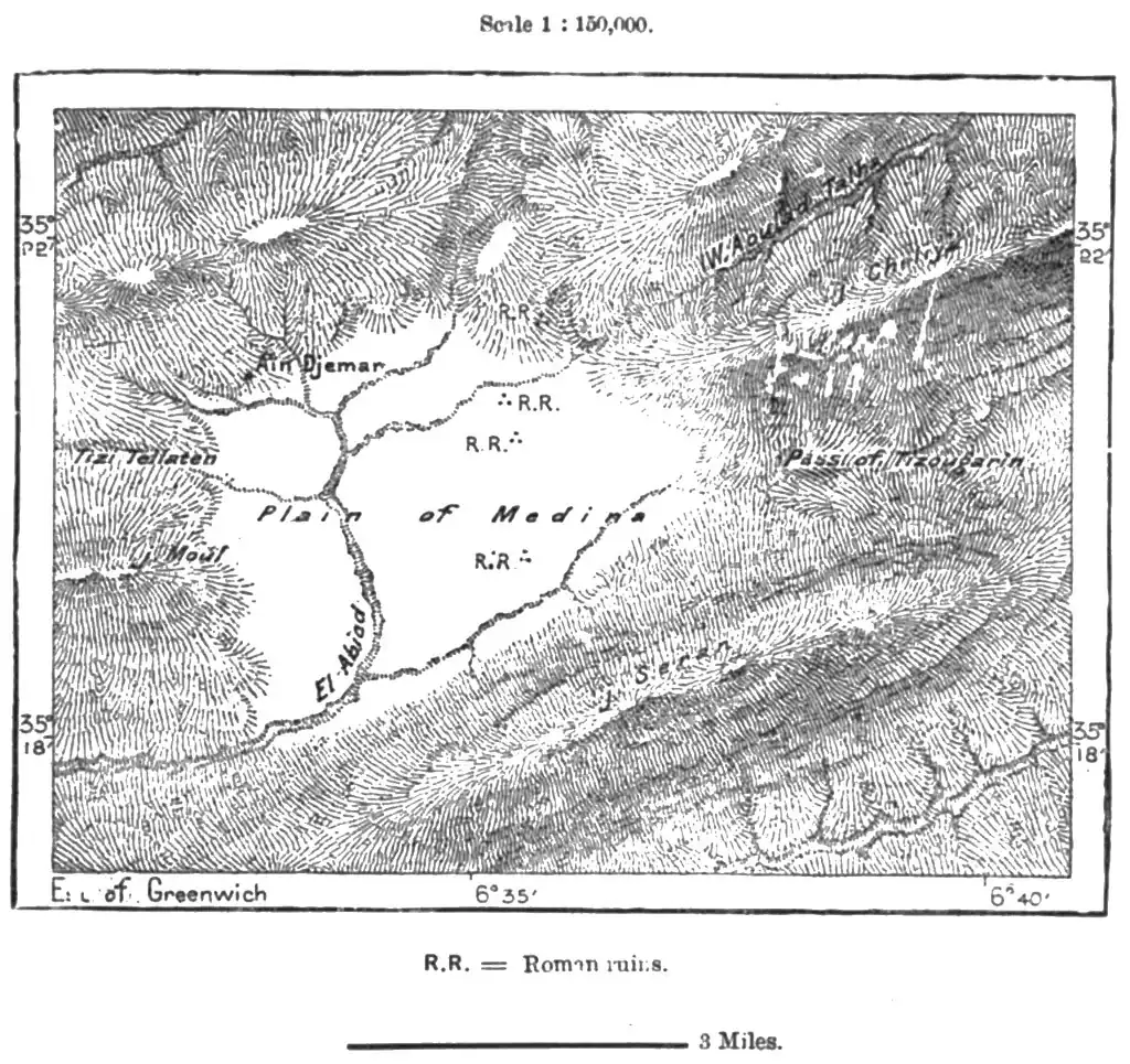 West of the Tizugarin pass stretches the extensive plain which seems destined to become the centre of European colonisation in the Aures, but whose rich pastures are meantime held in common by all the branches of the Ulud-Daud tribe. Here begins the valley of the Wed-el-Abiad, which has a south-westerly course, losing itself in the Sahara below the Tranimin gorges. The nearly parallel Wed Abdi Valley is held by the brave Ulad-Abdi tribe, whose stronghold