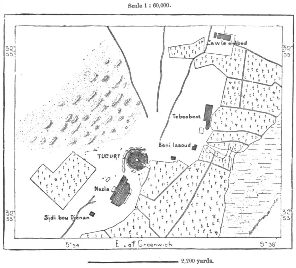 Tugurt, with its hundred and seventy thousand palm-trees, is the natural capital of the Wed Righ, and the oldest oasis in this region. It lies below the under- ground confluence of the Wed Miya and Igharghar, 230 feet above the sea, at the eastern foot of a plateau rising several hundred fect higher. Its form is that of an oval enclosed by a broad but now dricd-up ditch, beyond which it is protected by a mound from the ever-encroaching sands. Since the French occupation, in 1854 the population has doubled, and many of the old earthen or adobe houses have been replaced by dwellings constructed with blocks of gypsum, with galleries and upper stories. Suburbs have sprung up beyond the enclosures, and its trade and industries have been greatly developed. About 8 miles to the south is the religious metropolis of Temassin, containing the zawya of Tamelhat, a branch of the Ain-Mahdi confraternity, but now enjoying more authority than the mother-house, its influence being felt as far as Senegal.