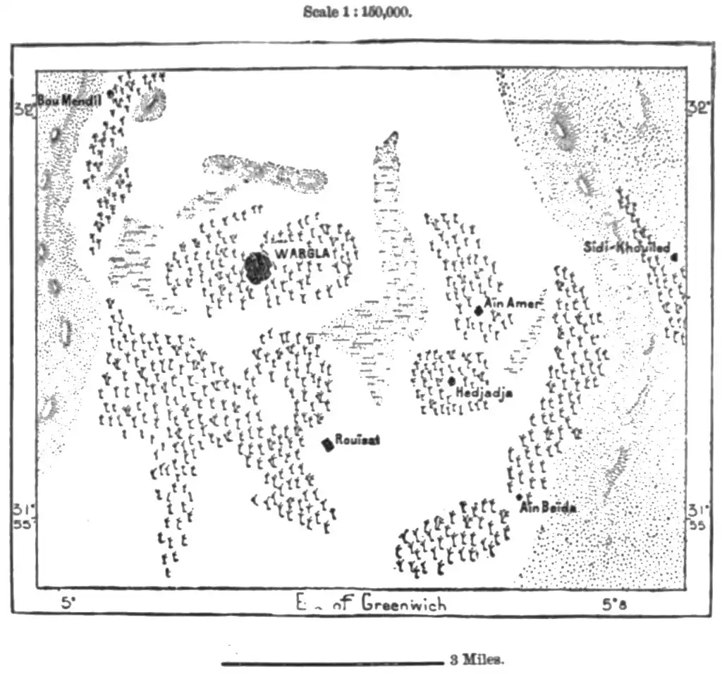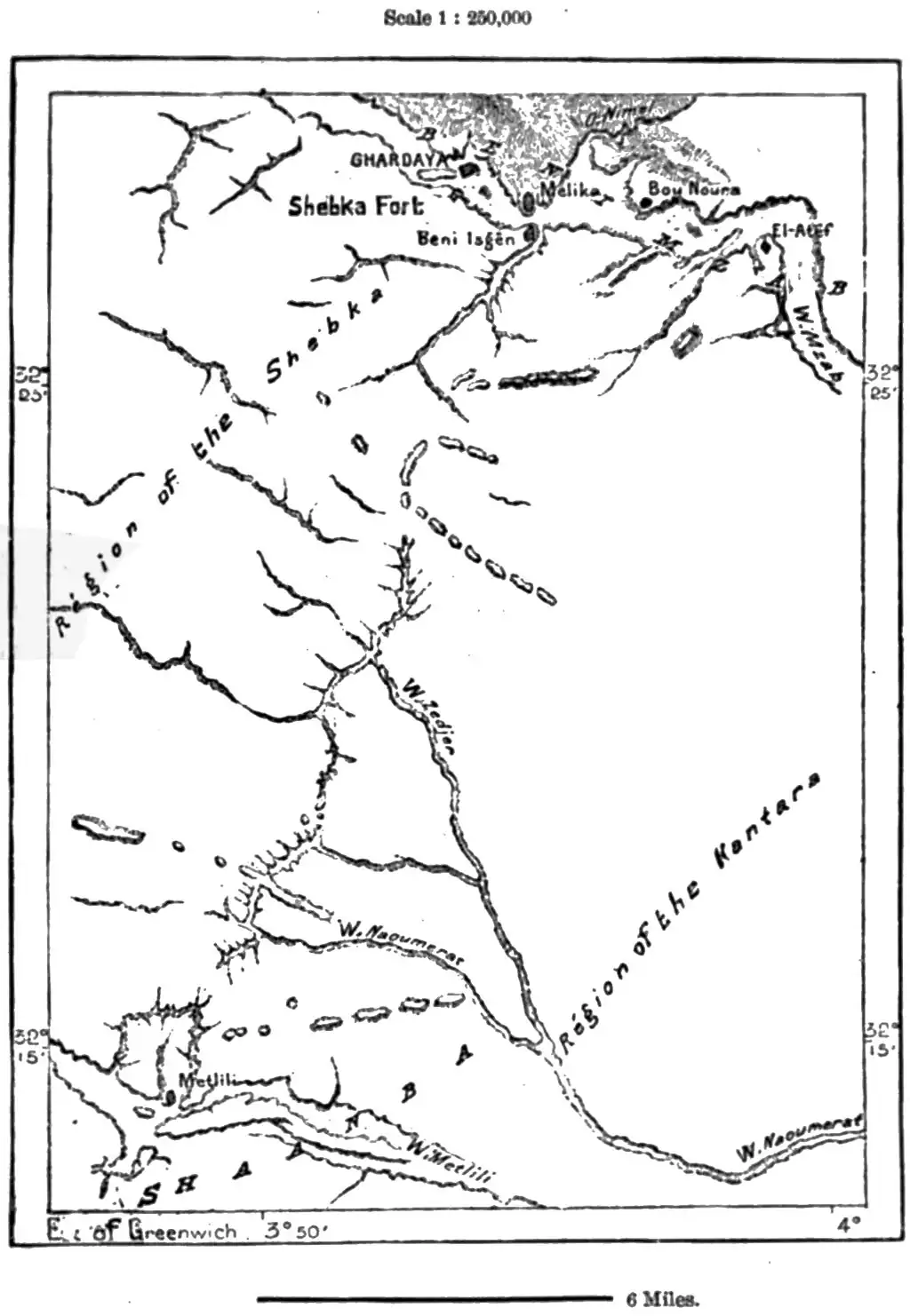 Like the oases of the Wed Righ, those of the Wed Jeddi belong also to the basin of the "inland sea," if this term can be any longer applied to the saline depression of the Shott Melghigh. More than half of Southern Algeria draining towards the Sahara, from the Jebel Amur to the Tunisian frontier, forms part of this basin, the central reservoir of which is at present almost dry.