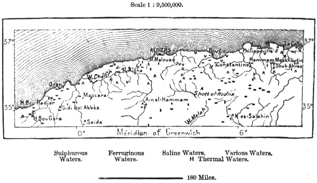 are even seen of avalanches. At some former geological epoch glaciers filled the gorges of the Haizer and Lalla-Khedrija slopes, and a large terminal moraine is still visible in the upper valley of the Wed Aissi. Elsewhere also are seen indications of the lakes which once flooded the depressions, but which have since run dry. Of all the Algerian uplands the Jurjura highlands abound most in running waters, rich vegetation, cool and healthy valleys sheltered at once from parching southern and cold northern winds.