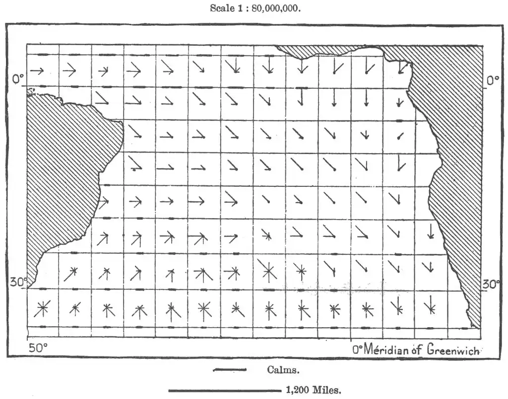 The most powerful of these backwaters is that which skirts the continental seaboard between Cape Palmas and the Bight of Biafra, and which sets from west to east with a mean velocity of a little over two-thirds of a mile an hour. But off Cape Palmas it attains an occasional speed of 3½ miles, or nearly 90 miles a day. This "Guinea Stream," as sailors call it, intervenes between the two sections of the equatorial current, which flow from the Old towards the New World, so that a vessel sailing either east or west parallel with the equator may take advantage either of the main or the counter current to accelerate its speed. The Guinea Stream shifts with the seasons, in September occupying more than half the breadth of the Atlantic to the south of the Cape Verd Islands.